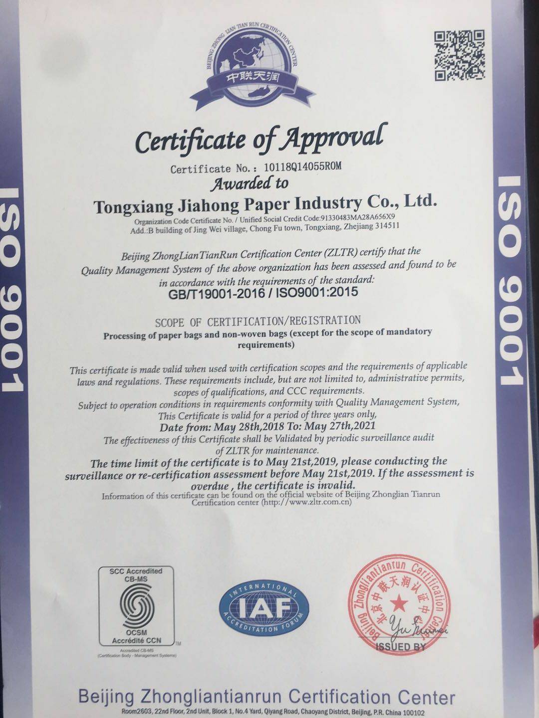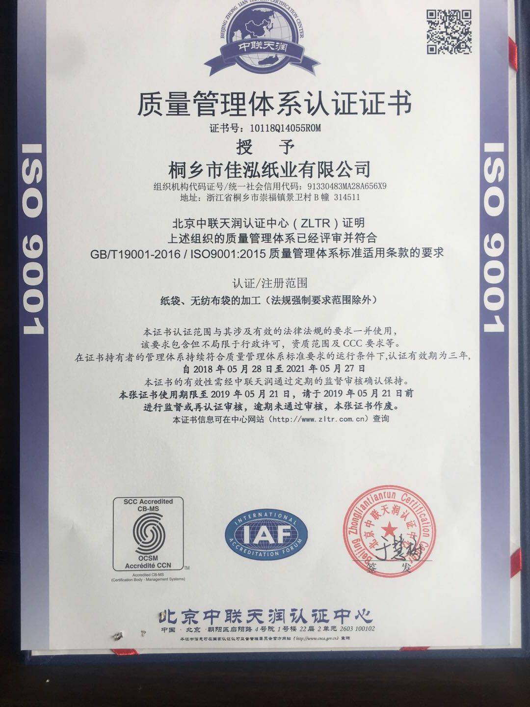 公司荣获IS9001质量管理认证体系证书